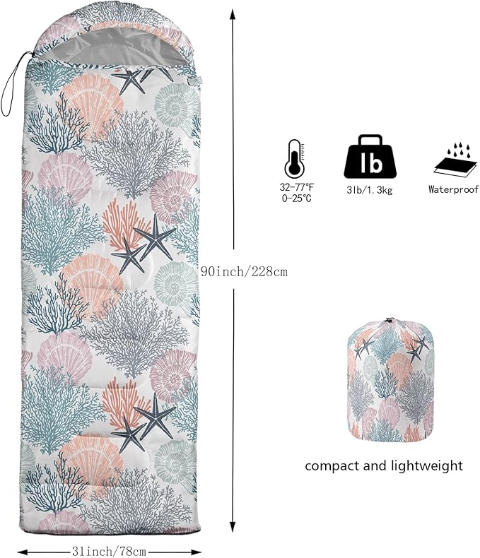 • Unique Nautical Design:This Nautical pattern sleeping bag is made of 3D digital printing with vibrant colors and patterns,size: 31W x 90L inches,temperature range: 32℉-77℉ (0℃-25℃),it also also have a weather resistant waterproof design to keep you warm and prevent you from any dampness,can be used in 3 seasons