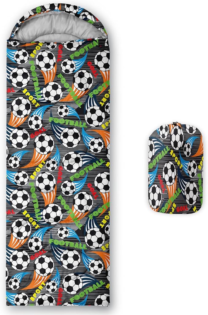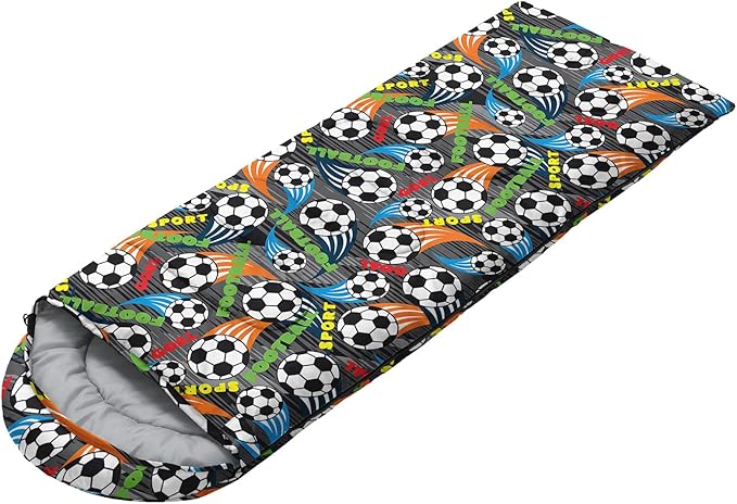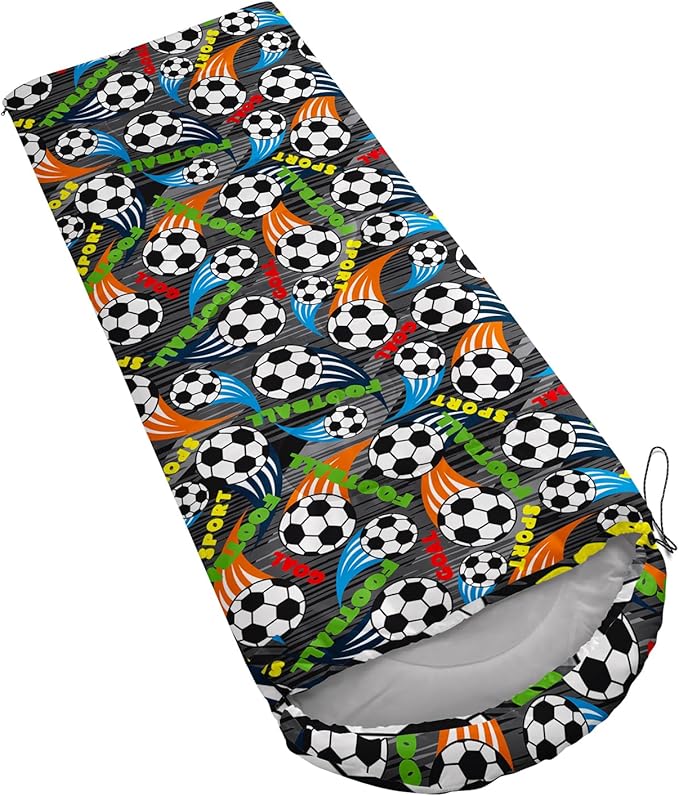 • Unique Soccer Design:This Soccer pattern sleeping bag is made of 3D digital printing with vibrant colors and patterns,size: 31W x 90L inches,temperature range: 32℉-77℉ (0℃-25℃),it also also have a weather resistant waterproof design to keep you warm and prevent you from any dampness,can be used in 3 seasons