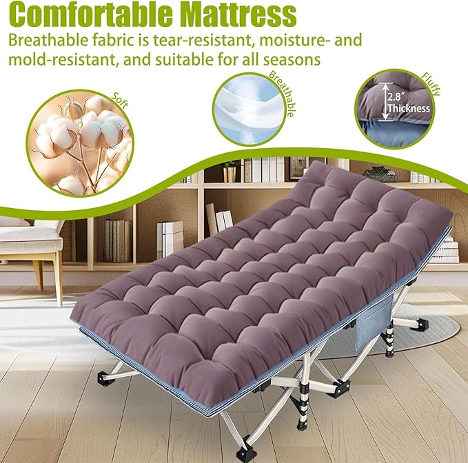 • Comfortable Mattress: This camping cot with mattress for adults comes with a soft pad, you can cover on the folding cot or use it seperate.The pad is vacuum-packed, which can be naturally fluffed after opening. Reducing pressure points for a restful sleep outdoors or indoors.